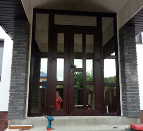 Входная группа из дверного ламинированого профиля с тонированым стеклом. Получилось солидно и функционально.