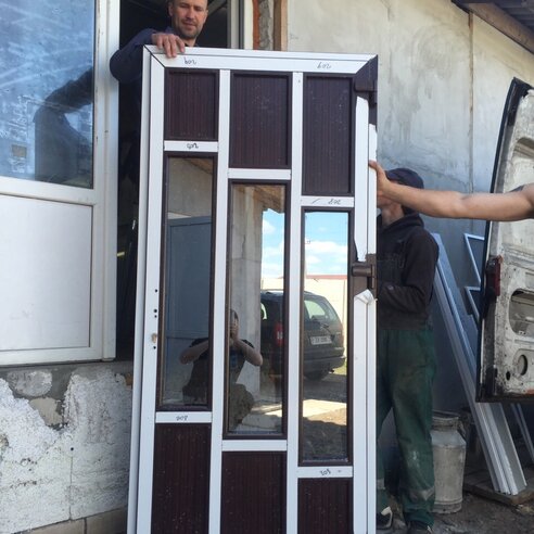 Входная группа из дверного ламинированого профиля с тонированым стеклом. Получилось солидно и функционально.